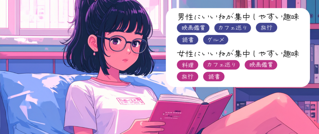 「いいね」を貰いやすい人気の趣味は、異性と共有しやすいものが中心です。例えば「グルメ」や「映画鑑賞」「旅行」などは、初デートの行き先や会話のきっかけになりやすい趣味です。