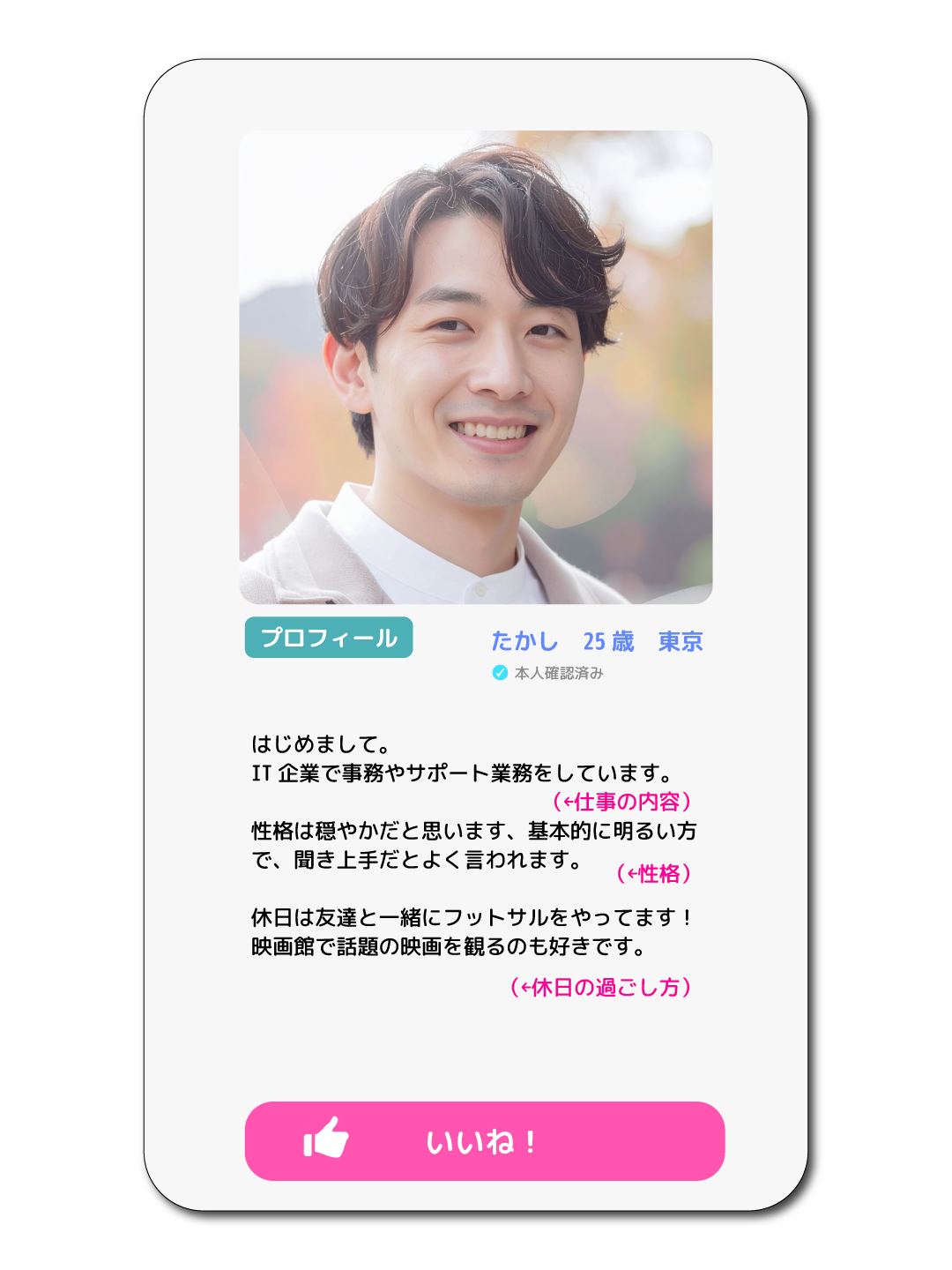 メイン写真は、検索結果の一覧に表示される自分の顔となる画像です。高画質なスマートフォンのカメラを使用し、自然な笑顔を掲載すると、相手からの反応率が向上する傾向にあります。